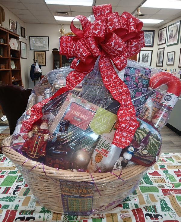 Festive & Fun, this basket is bursting with $50 of Lottery Tickets, Margarita Mix, Tequila, Moonshine, Jim Bean, Holiday Nog, and Candy!